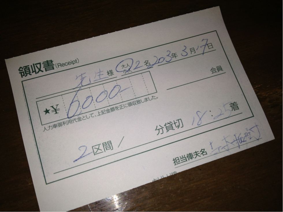 そして↓の写真ですが、イベント後、浅草にて一刀さんと人力車に乗った際の領収書。